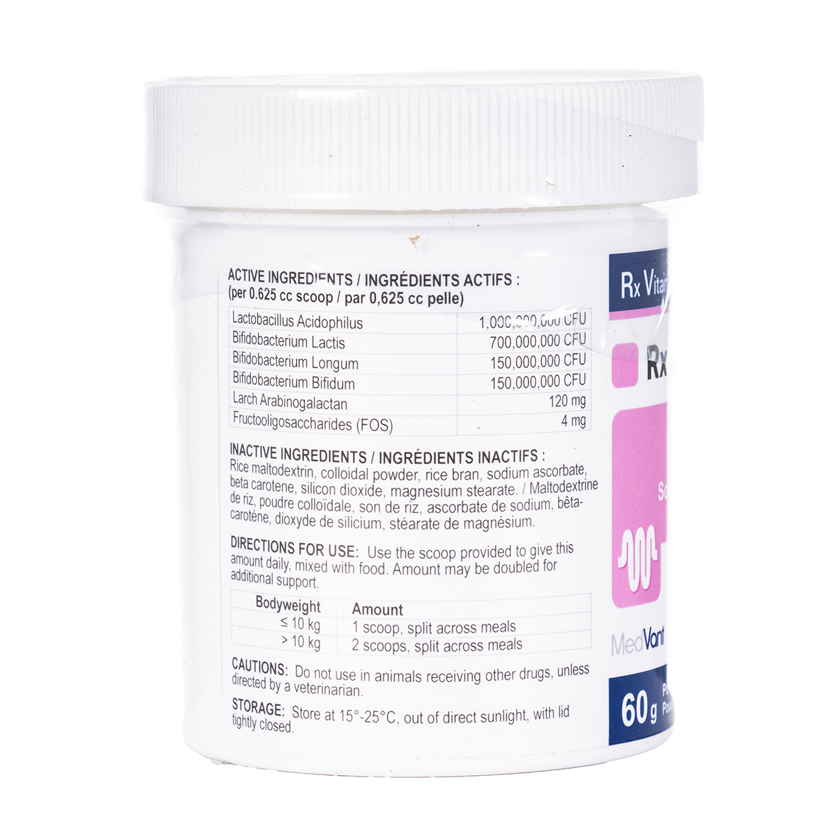 Contains multiple strains of high potency prebiotics and probiotics delivered in a palatable powder with no flavorings or additives, to help maintain normal, healthy intestinal micro-flora and normalize bowel ecology in dogs and cats.