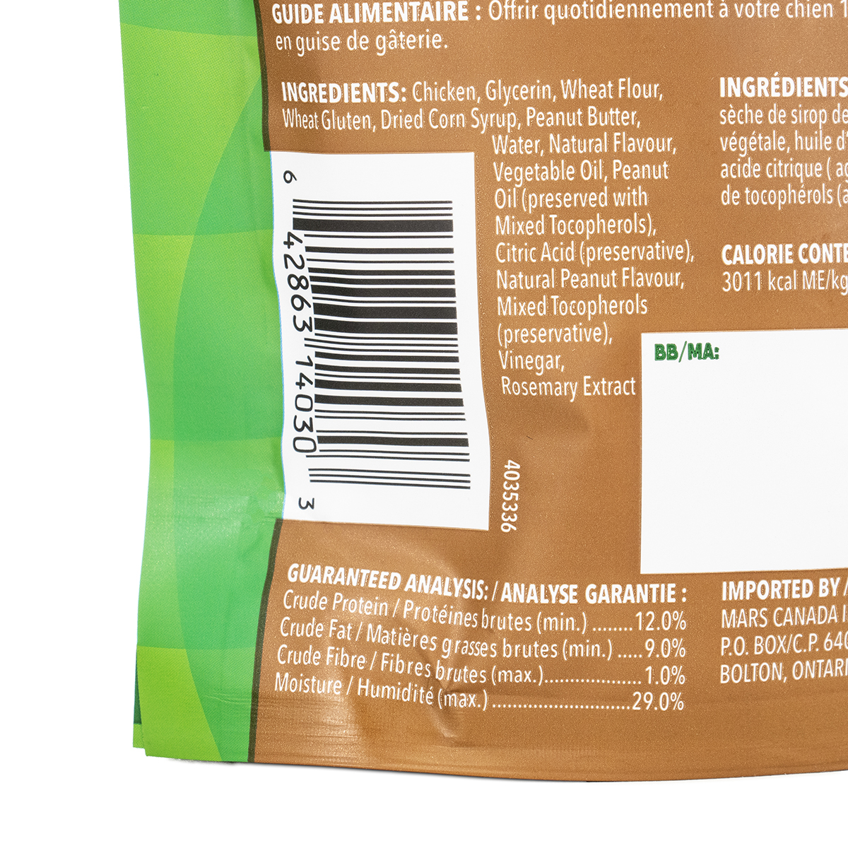 Rehydrated chicken, glycerin, wheat flour, wheat gluten, peanut butter, dried corn syrup, dried cultured skim milk, peanut oil (preserved with mixed tocopherols), vegetable oil, natural flavors, sodium bisulfate, xanthan gum, preserved with mixed tocopherols, rosemary extract