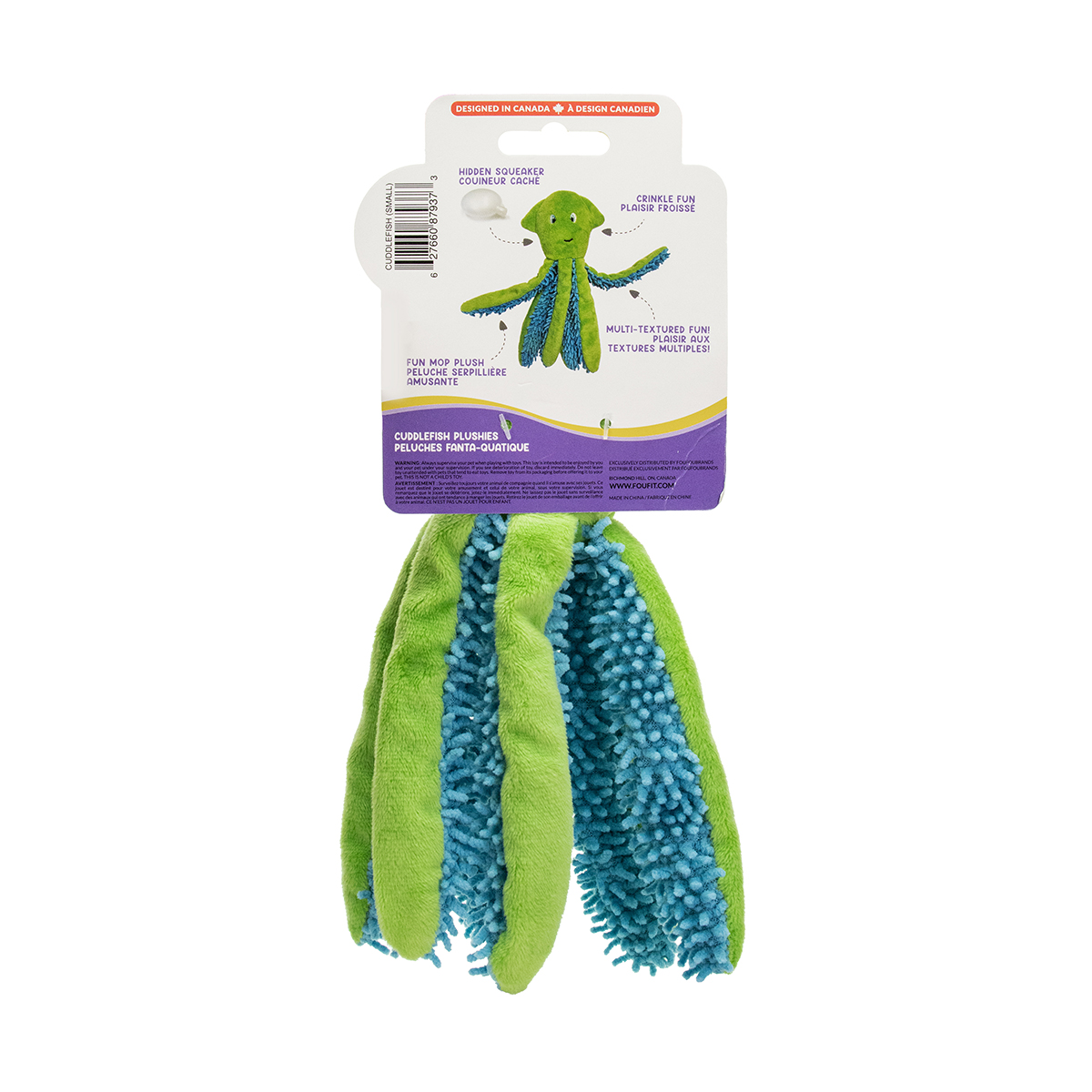 Have a dog that loves to cuddle? Well they’re going to love our new CUDDLEfish Plushie toy! I mean, “cuddle” is in the name! Made with a mixture of plush and a soft mop fabric, this multi-sensory plush toy is sure to please. A hidden squeaker and crinkle sounds add extra engagement. Cuddle, toss, or tug on the long floppy legs! Great for puppies to medium size breeds.